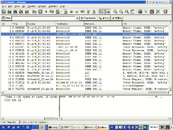 所以在使用Ethereal捕捉无线局域网的数据包时,选择正确的无线网卡工作模式就是非常关键的了。下图是安恒公司无线网分析工程师在linux系统上使用Ethereal捕捉和分析安恒公司实验用无线局域网时的抓图,点击可以放大。